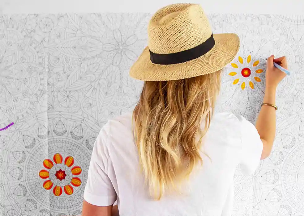 Leg de kleurplaat op de keukentafel, start eraan op de grond of hang hem gemakkelijk met schilder tape op aan de muur. Waar je ook begint, je ziet de mandala groeien!